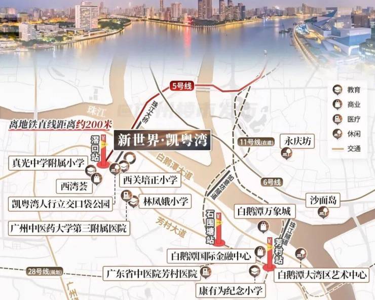 全龄教育体系:项目配建华师大幼教基地凯粤湾实验幼儿园,引入省一级西关培正小学凯粤湾校区,对口广州四中新世界校区(公立完全中学),覆盖2-16岁全龄段教育。