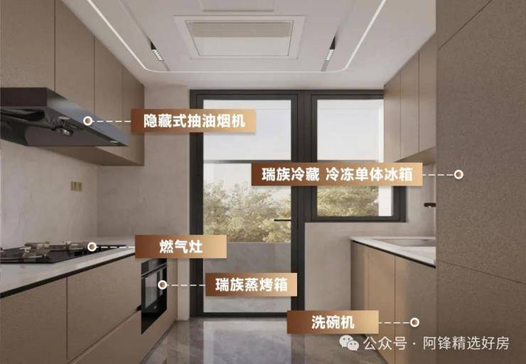127㎡全明星厨电品牌升级,精选「老板」和「瑞族」厨电,实现功能与生活方式的高度契合,「老板」升降式油烟机强风量快速吸排,三眼灶具支持智能感温烹饪,更符中式家庭生活习惯;「瑞族」蒸烤箱及冰箱,体现高端人居精致享受。