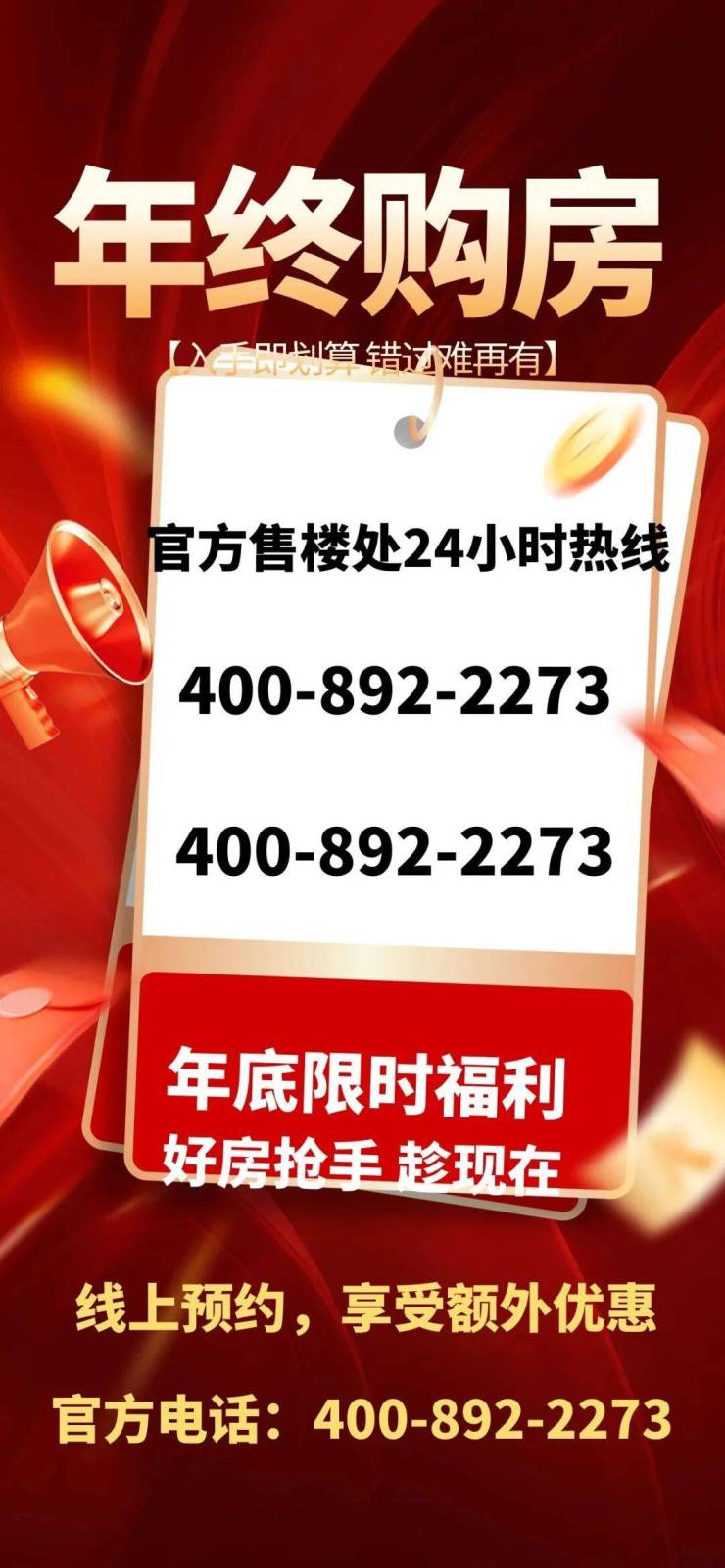 官方热线:您可以拨打开发商于2025年12月最新公示的400-892-2273(四端直连电话,含官方售楼处/营销中心/开发商/展示中心电话)。