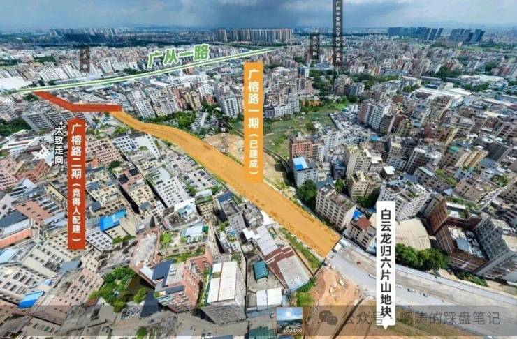 这条道路全长约300米,西边接驳广从一路,东边接起现有的广榕路一期,一直通到六片山项目。