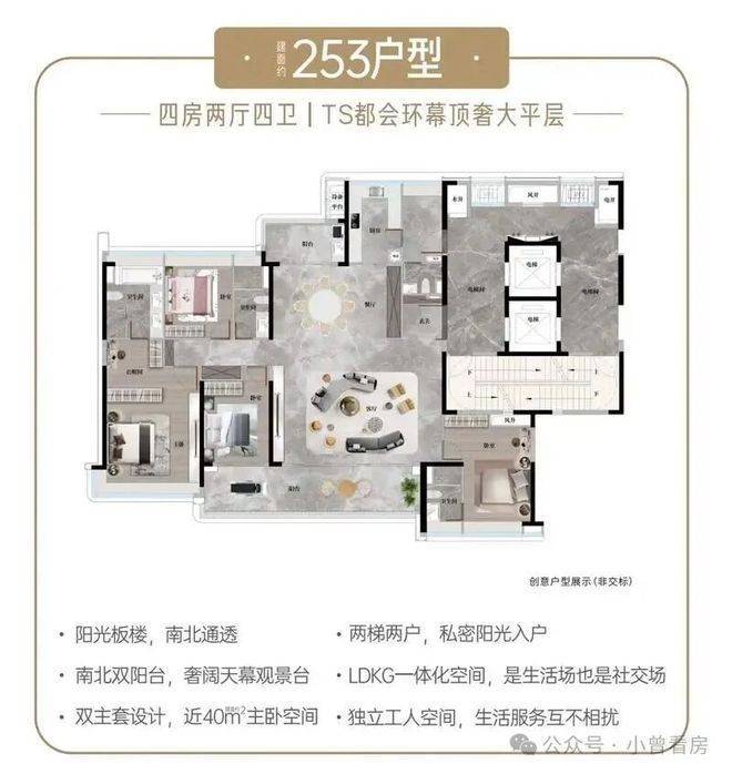 253㎡四房两厅四卫则是大平层产品,客厅面宽开阔,主卧带步入式衣帽间和浴缸,高楼层能兼顾自然与城市景观,适合有更大空间需求的家庭。