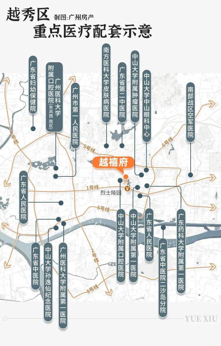 越秀区内有14家知名三甲医院(车程10分钟内),占全市数量的约40%