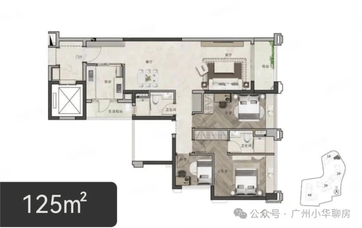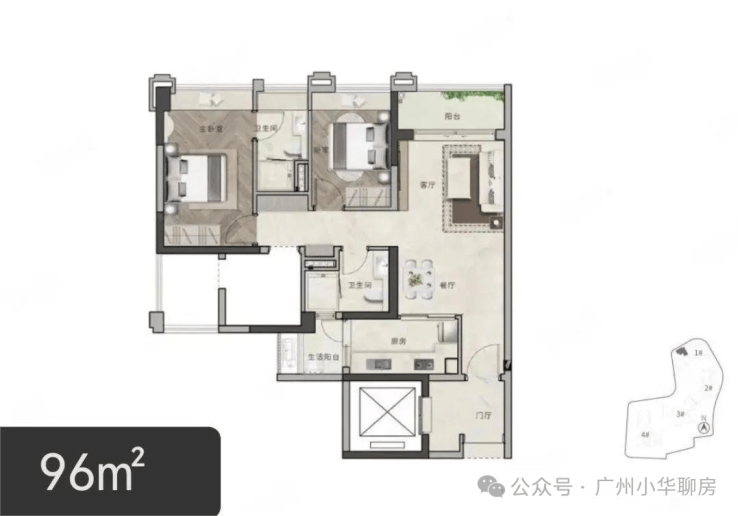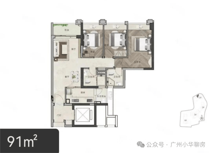 1#靠近万福路,一共有五个户型,分别是91平3房、96平2+1房、120平3+1房和125平3+1房AB两个户型,