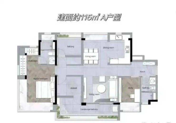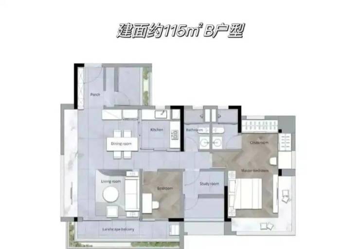 115平B户型有做样板房,也是楼盘的主力户型,货量最多。空间感很强,不说的话完全看不出这个户型面积只有115方。