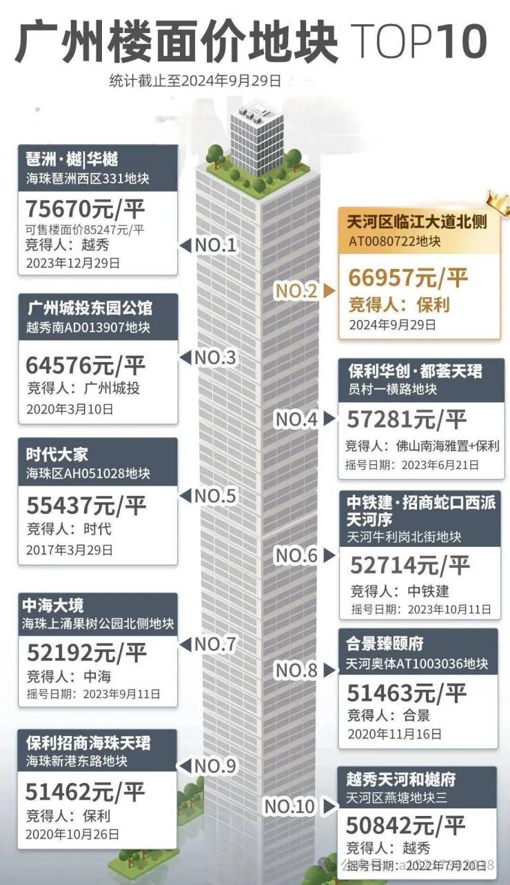 :广州 10 月土拍市场迎来爆发,7 宗优质宅地集中入市,覆盖海珠、天河、白云、番禺等核心区域。其中,中海地产以 9.2 亿元竞得海珠区广州大道南 788 号地块,住宅可售楼面价约 4.4 万元 / 平,该地块需配建中小学等配套设施。