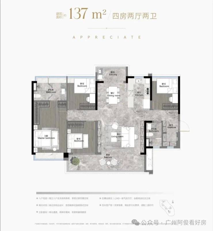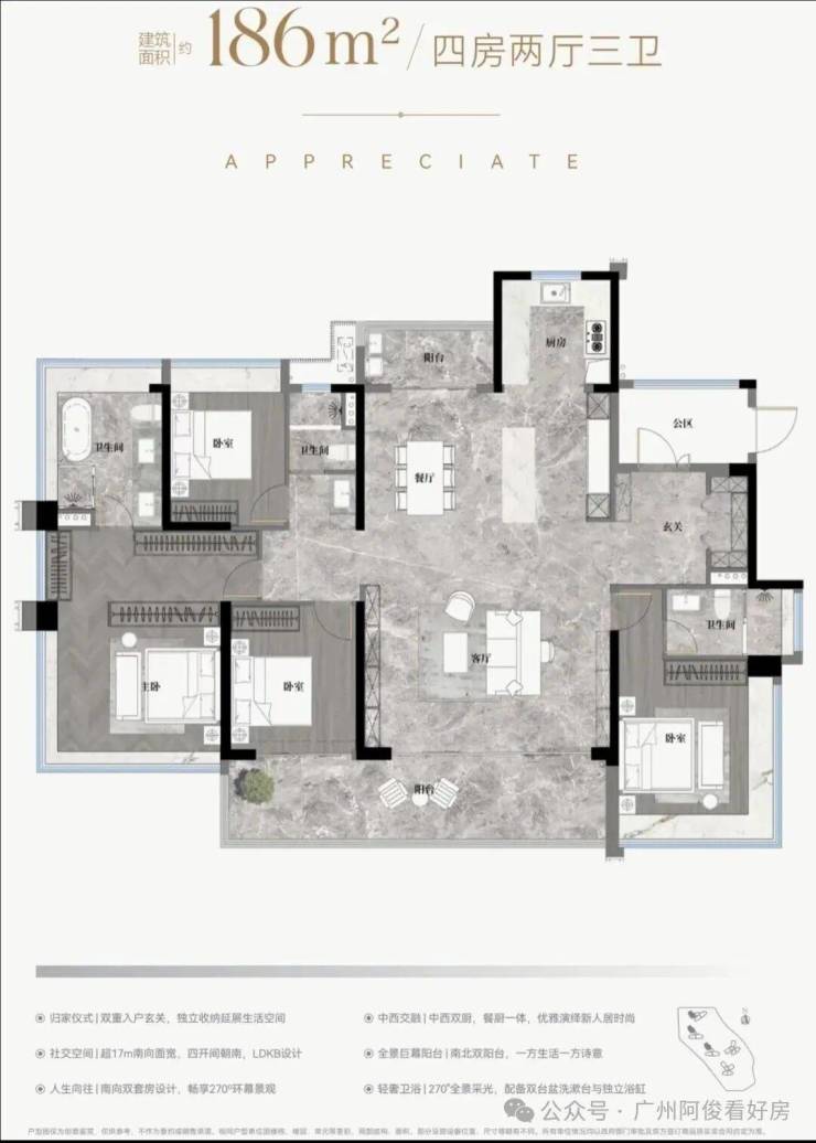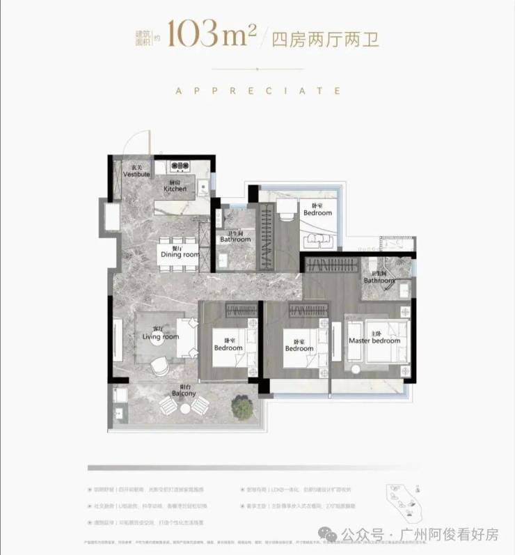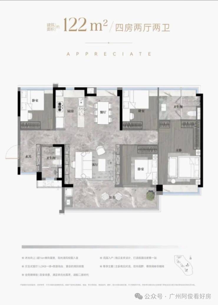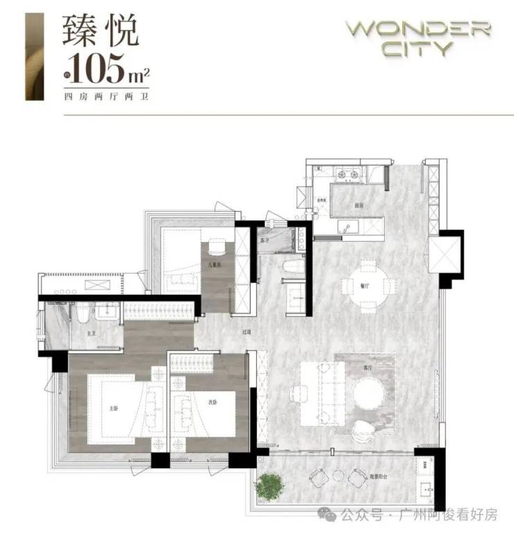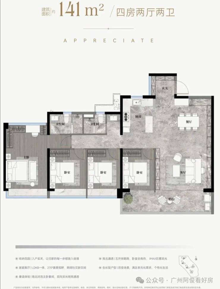 105㎡四房:四开间朝南,5.9m巨幕厅,主卧270°飘窗,实用空间媲美传统130㎡。