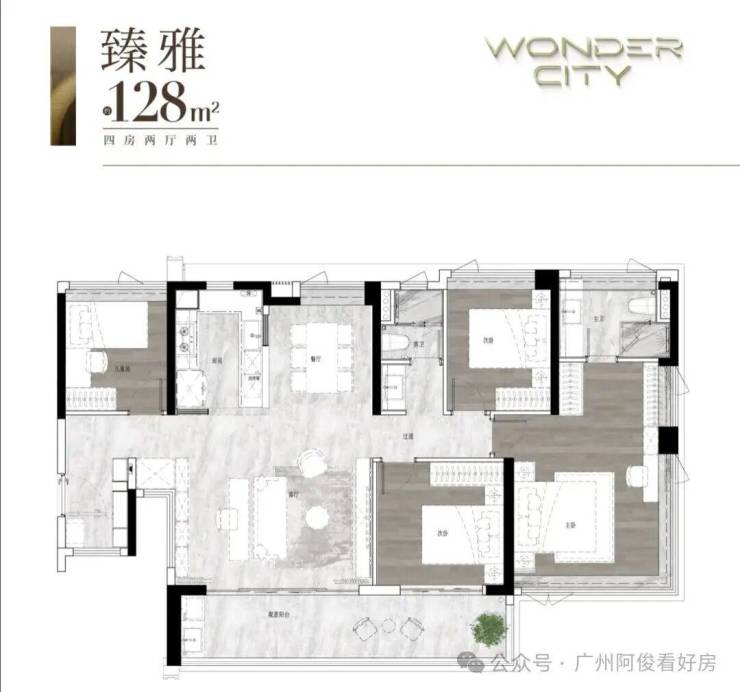 128㎡四房:南北对流,8.65m阳台+4m奢阔主卧,南向面宽约15.65m(对标汇悦台大平层)。
