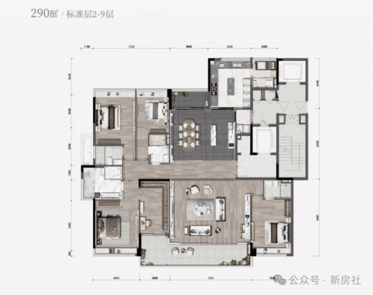 4.提供多种户型选择,包括198㎡到289㎡的4房单位,南北通透、全明格局,动静分离,采光通风良好。