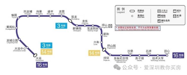 4站到龙岗中心城,大运站可换乘时速120KM/H的14号快线⑤,直达罗湖、福田,2站直达坪山高铁站