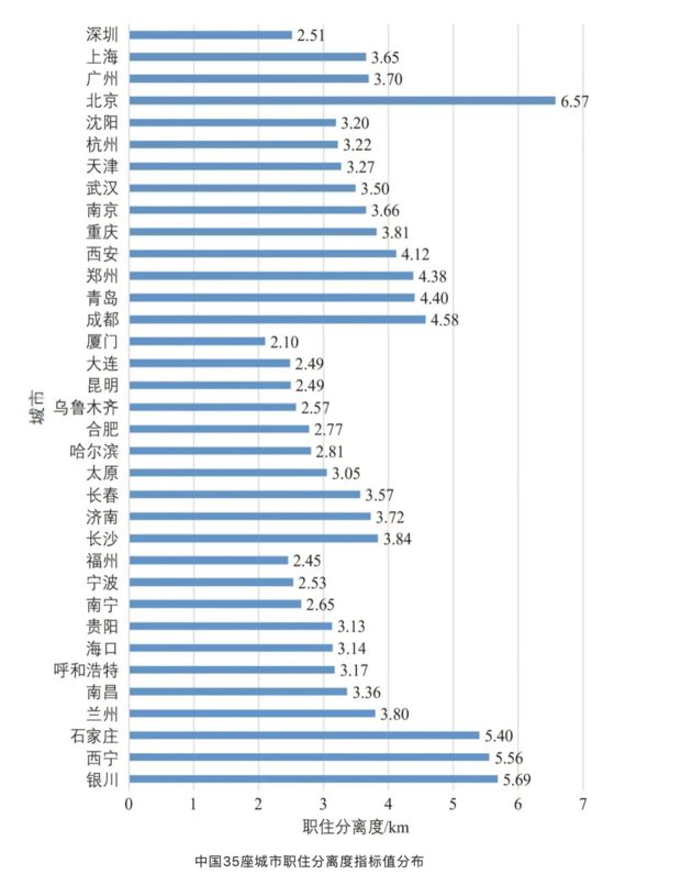 职住分离度以km为单位,指理论上能够实现的最小通勤距离(不考虑就业差异与人的选择,在既有职住分布状态下通过交换就业地)。而市民的实际通勤还受到土地开发政策、居民收入、交通系统可达性等因素的影响。