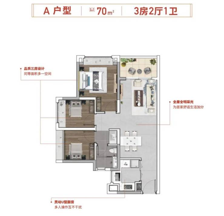 1. 70㎡,三房一卫户型