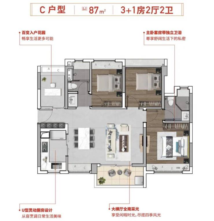 3. 87㎡,四房二卫户型
