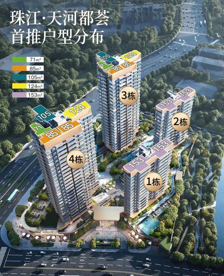 珠江天河都荟,总占地面积5.5万㎡,总计容建面11.56万㎡,分南北两地块开发,首推北地块,容积率2.0,共4栋,货量284套。首推建面约72-152㎡,户户朝南,超宽楼间距。