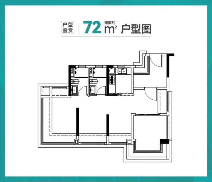 建面约 72㎡的户型,是刚需族的高性价比之选。它带有入户花园,南向四面宽,每个房间都配备飘窗,客厅连接景观阳台,配置丰富。而且,加上高使用率的优势,实际居住体感舒适,可媲美约 90 方的产品。