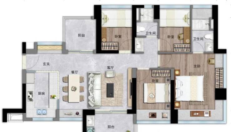 约76㎡3房2厅1卫:竖厅设计,进门入户玄关,S墙设计预留冰箱位,U型厨房,餐客厅一体连接阳台,卫生间三段式分离,阳台是朝东北、东南或西南向。