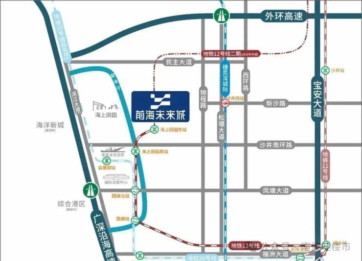 蔚蓝海尚位于整个项目的东北角,地块呈梯形,家门口就是12号地铁线“海上田园东站”,一期是最靠近地铁站的,2站到国展北站可以换乘20号线,6站到福永站还可以换乘11号线,快速通达宝中,南山区。