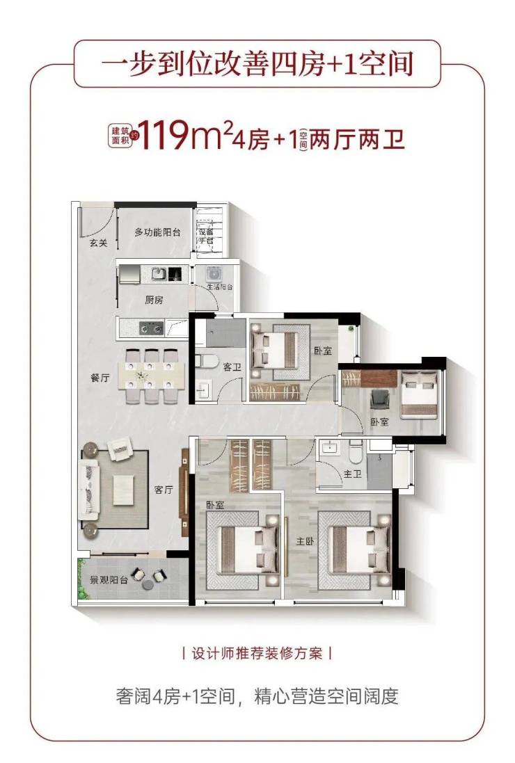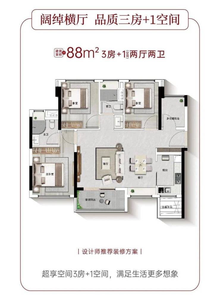 三房之上,多得一个实用空间,随需求灵动打造。随心定义,可作静谧书房、雅致琴房、怡情茶室,或专属兴趣天地,从容满足家庭的多样需求。