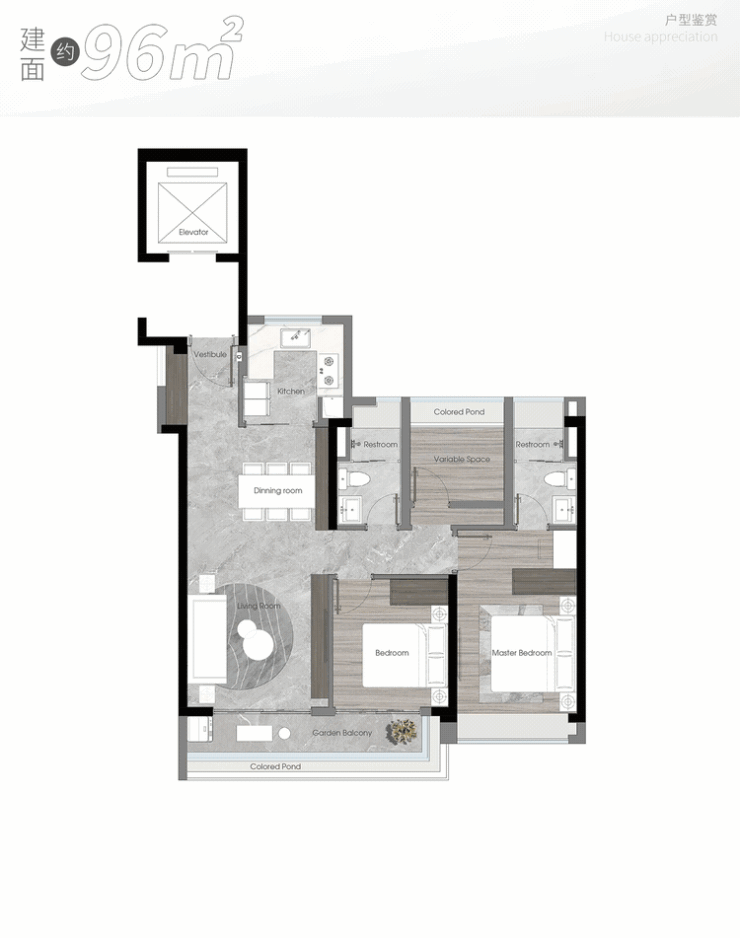 建面约96㎡户型,三开间朝南,在同一赛道上能直接秒杀对手。同是100㎡以下,市区拥有独立电梯厅的小户型,且配有全系统豪华主卧,只有它!