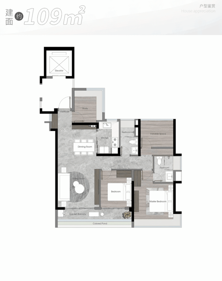建面约109㎡户型同样独具优势,首推房源南向望一线滨水美景。它有两组亮眼数据:一是使用率超85%,功能与尺度合理交互;二是窗地比高达约48.9%,将南北对流的优势发挥极致。