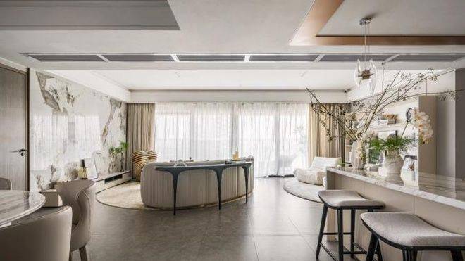 珠江·海御在精装设计方面也以高端品质和人性化细节为核心,为业主打造舒适、奢华的居住体验。最大的亮点无疑是利用海景,利用大面宽阳台,将自然引入室内,旨在突出生活的自由、个性。大面积的自然采光加持,让室内的平和松弛感拉满,利落的线条和不同材质的肌理突显光影叙事。空间规划更开放,不设过多隔阂,让业主充分感受自由的空间尺度。向内的私享空间,设计手法趋于沉稳克制,在材质的选择上强调贴近居住的细腻触感,突显生活品质。