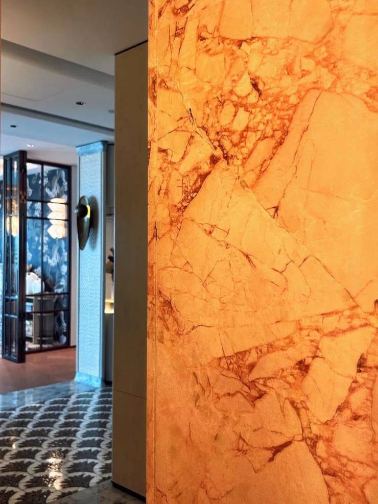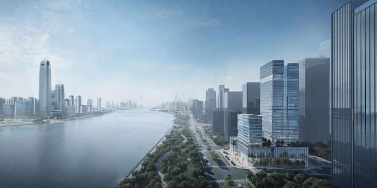 其次,项目外立面采用木色陶板与全景玻璃幕墙,以“曲水流觞”的涟漪造型呼应珠江文脉。