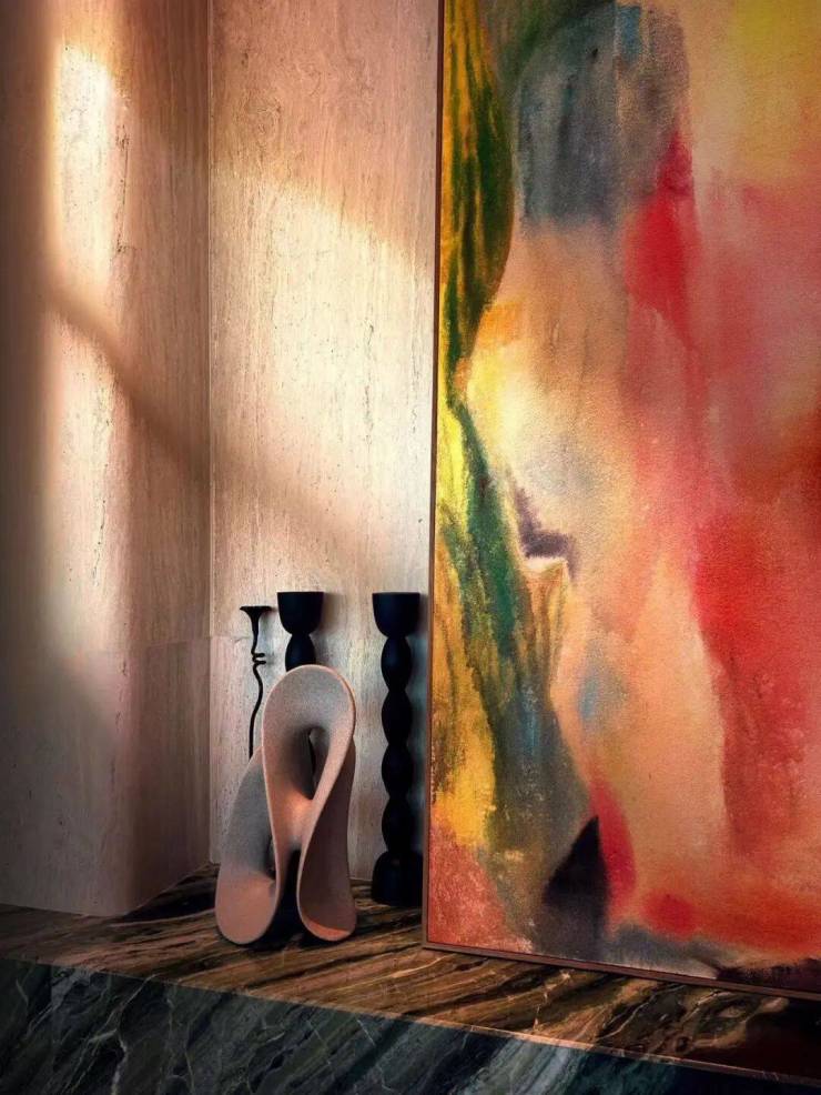 在样板房装修上,透过图片能感受到软装实力比市面其他房企出色不少,整体采用多种材料的拼接风格,艺术感与精致感兼具的搭配思路。