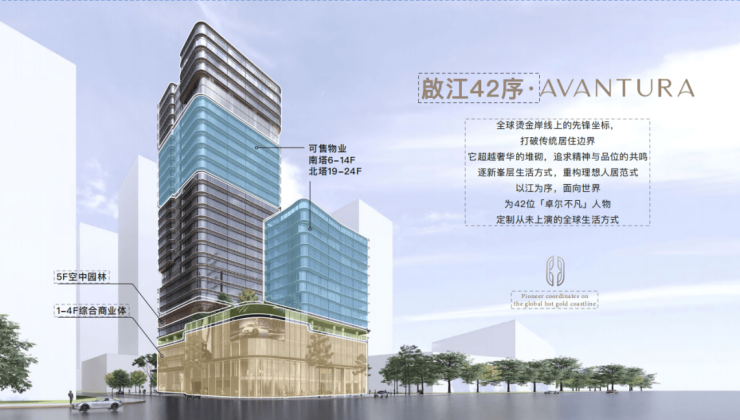 广州·啟江42序总占地面积约7600㎡,整体分为南北两座塔楼,南塔高约60米,北塔高约131.9米。