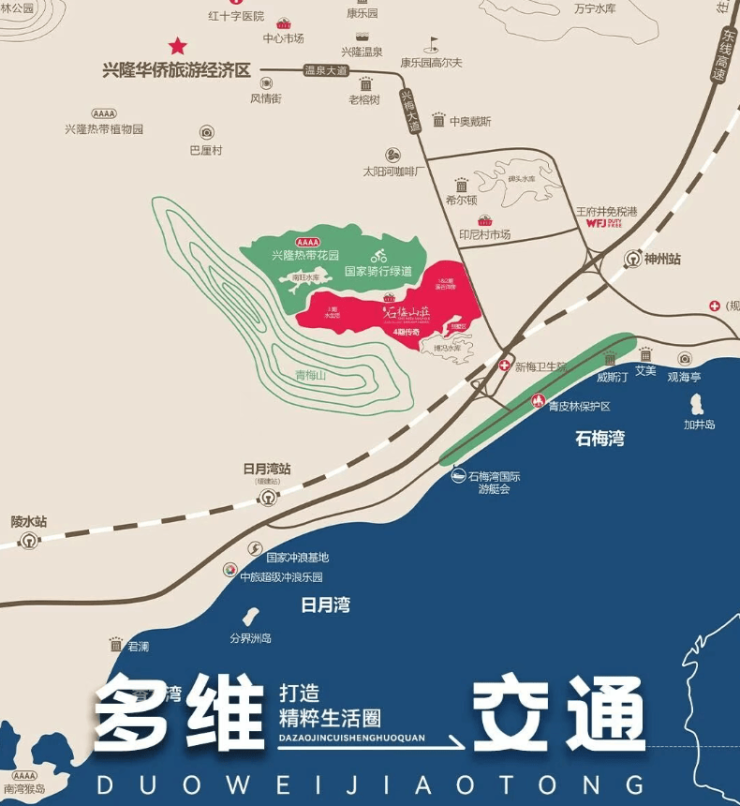 ● C位地段项目位于海南万宁石梅湾旅游度假区C位,拥有“山、林、湖、海、泉”五重生态,推窗见绿,出门是海,养老度假双buff叠满‼● 多维交通三亚/海口机场1.5-2h直达,环岛高速双出口,还有社区公交直达兴隆镇中心,出行无忧‼