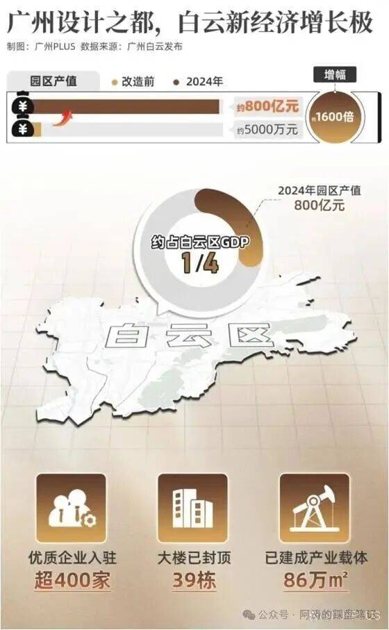 广州设计之都,2019年动工,2022年首期开园兑现飞速,仅3年,年产值从改造前5000万元飙升到800亿元,暴涨了约1600倍,相当于2024年白云区GDP的1/4;成为了白云新的经济增长极,未来可期。