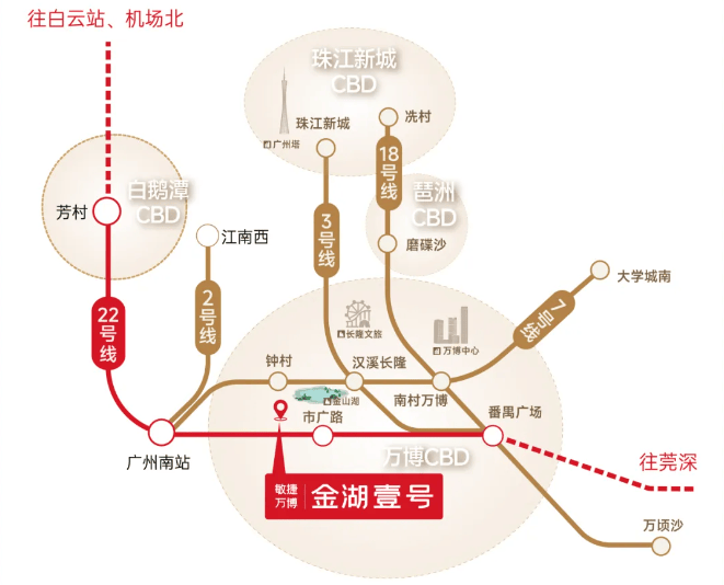 项目直线距离约800米处,就是22号线市广路站(已开通),2站到万博核心,3站通琶洲、4站达珠城,通勤相当便捷。