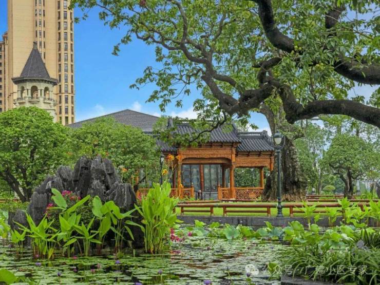 以水为核心,以约200多棵高大乔木、约29组富贵绿石及英石为主要景观,大量荷花等水生植物作为衬托,园林和建筑融合得美轮美奂