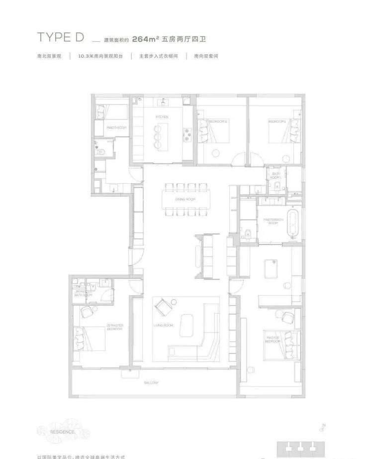 264为五房两厅四卫产品,更细腻的产品设计,超奢华四件套南向主卧,标准南向次主卧, 6.6米巨型方厅,纵向超长LDK一体化空间,专属家政保姆空间,超大容量收纳空间,令居住的尊贵从每处品质细节里流露而出,创造独一无二的奢享体验。