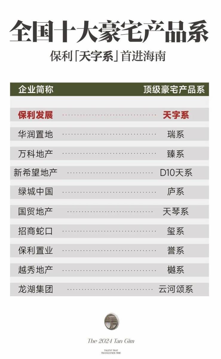 天字系,以客户需求为圆心,根据城市基座,提出“甄选城芯、产品打造、服务配置”三个方面的严苛要求,因而成为保利顶级豪宅产品系。且是全国十大豪宅产品系中首位进入海南的。