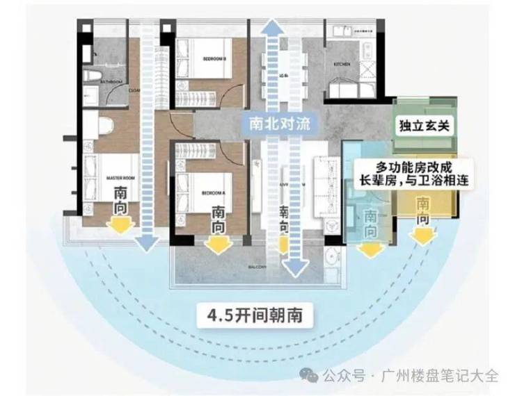 整体价值:约46㎡客餐厨空间+约26㎡南北对流主卧套房+4开间朝南+约14.5米南向采光面
