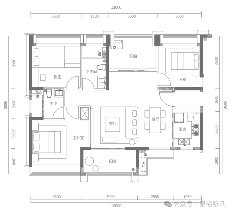 C户型建面约120㎡,3+1房2厅2卫