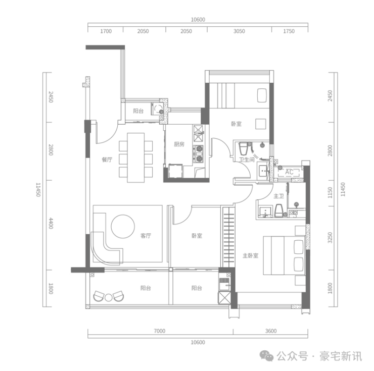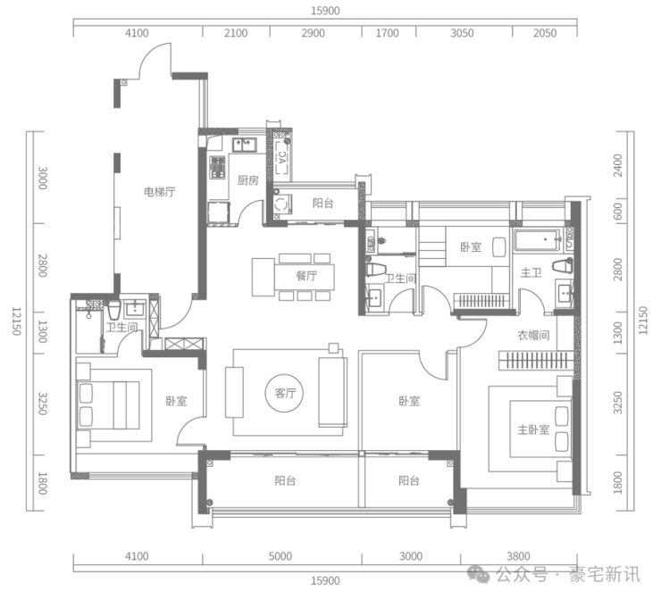 D户型建面约173㎡,4房2厅2卫