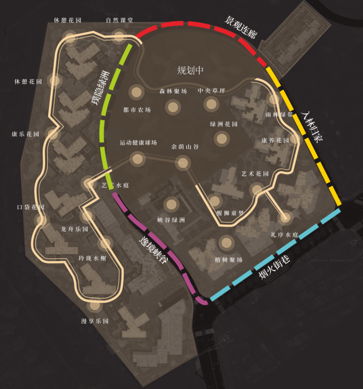 •横一路归家大道+环一路森境谧道+中央花谷逸境+峡谷商业内街