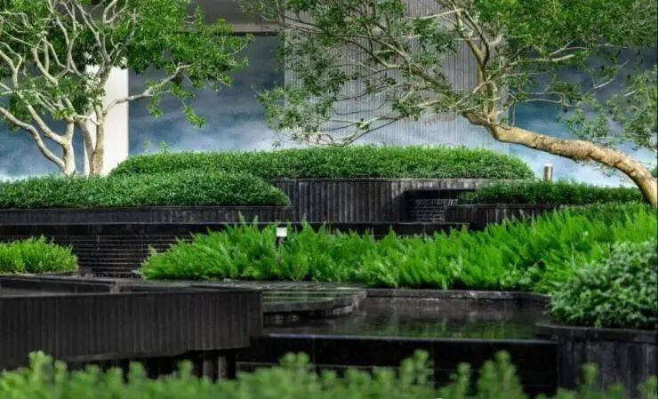 高低错落的景观层次丰富,绿篱与乌桕、铁冬青等树种相互映衬,带来极大视觉享受。