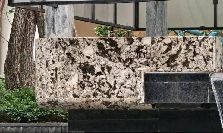 茶室底座,用的是巴西进口的雪山银狐奢石。这类奢石,因为独特的透光性,一般用于顶豪室内装饰,如今却被保利大胆用在园林公区,奢华程度可见一斑。