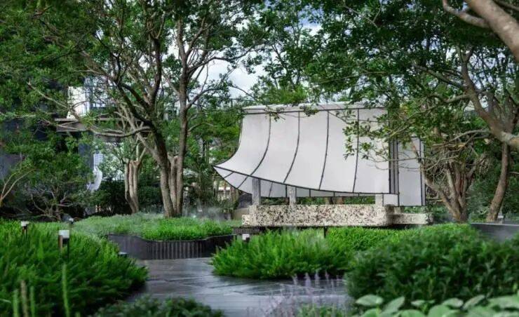 园林中央,特别打造的小区社交据点--悬浮茶室,以别致的帆船造型漂浮在水池之上。挑起的檐角,看似简单,但实则工艺难度极高。