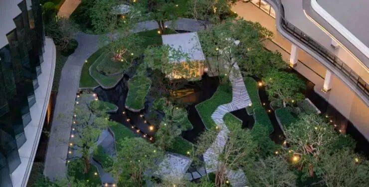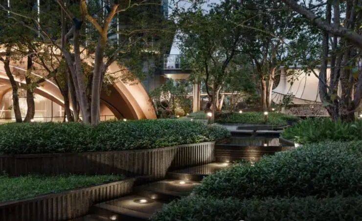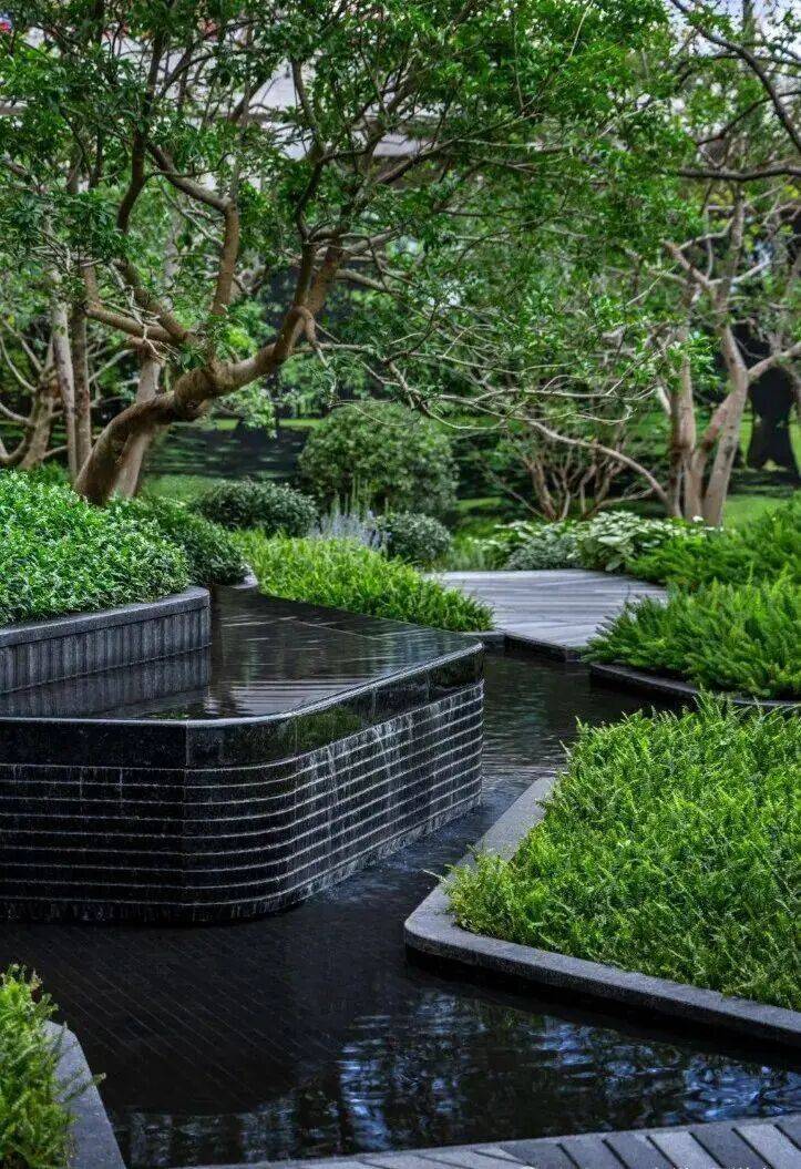 水流从入口叠水瀑布倾泻而下,奔向中央镜面水池,再沿着步道溪流蜿蜒流至全园各处,业主们沿着步道漫步,能依次体验 “听水的舒缓、观水的灵动、亲水的惬意”,这是传统平面园林没有的感受。