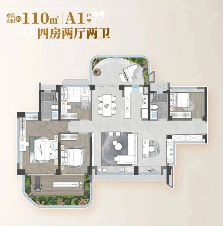 再看110㎡的四房两厅两卫,特别适合二胎或三孩家庭。一进门有个独立玄关,回家可以随手放钥匙、挂外套,隐私性也不错。客厅和餐厅是竖厅设计,开间 4 米,摆上沙发和餐桌也不挤,周末叫上朋友来家里聚餐都够用。主卧是套房设计,带独立卫生间和衣帽间,早上夫妻两人洗漱不用抢,衣帽间还能放下全家人的衣服。另外三个次卧中,有一个直接连接着 7 米长的景观阳台,采光特别好,可以给老人住或者改造成儿童游乐区。厨房是 U 型布局,洗菜、切菜、炒菜动线合理,旁边还有个生活阳台,平时放洗衣机、晒抹布很方便。