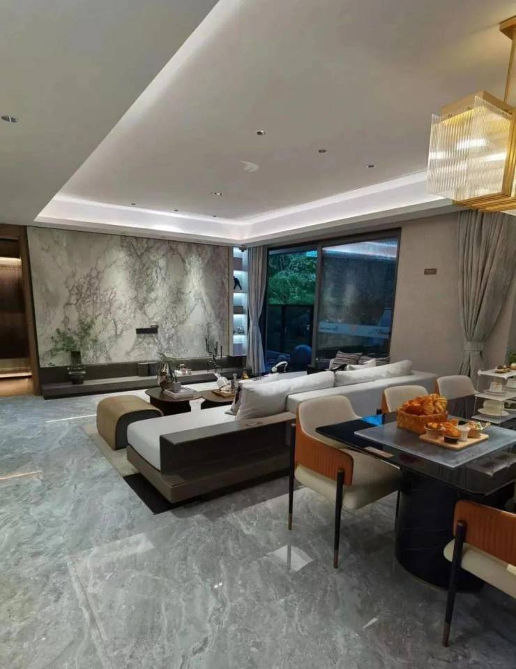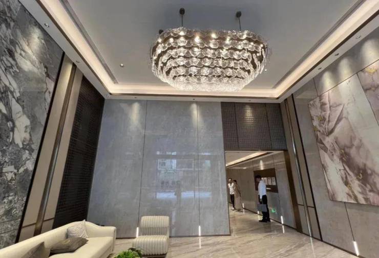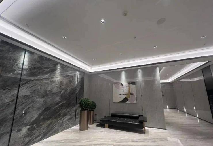 天汇五期做了双大堂的设计,负一层也有入户大堂,岩板的背景墙+金属包边,还有高端项目标配的星空顶。