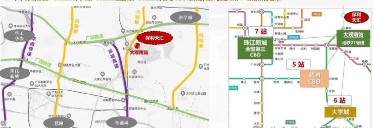 项目在售五期距离21号线大观南路站约1.5公里,步行22分钟,骑单车大概8分钟左右,乘坐21号线一个站可换乘4号线去往金融城、琶洲,4站到员村换乘5号线直抵珠江新城,自驾的话,周边有广深高速、广园快线、大观路,还有在建的机场第二高速,40分钟内可去往CBD中心。
