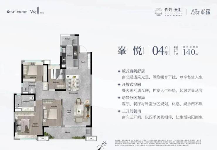建面140平四房,南北对流户型,南向三开间,餐客厅一体化设计