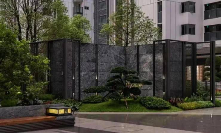 入户大堂是社区的颜面,五栋大堂前放置有两棵大型的景观树,景观树前是楼栋指示矮墙,旁边都有绿植,显层次,入户大堂分开外层与内层两部分,外层更注重实用性,岩板+金属踢脚线,天花做了金属格栅和氛围灯带。内层深色系大理石背景墙,四周都做了金属包边,大型的玻璃吊灯,还搭配了金属摆饰,偏酒店风。