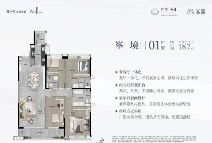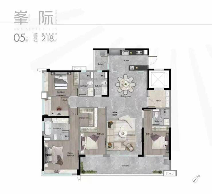 建面218平五房,10米景观阳台,双套间,南北对流,独立电梯厅,四开间朝南,飞机户型,LDKG一体化设计,三面衣帽间。