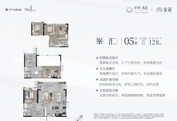 建面128平复式四房,西北朝向,全景主卧,上下分层有序,三个卫生间