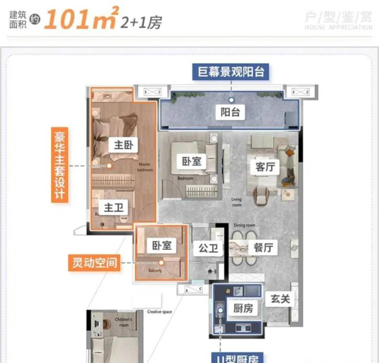 建面101平三房,经典竖厅设计,全屋动静分离,宽景大阳台,主卧套房