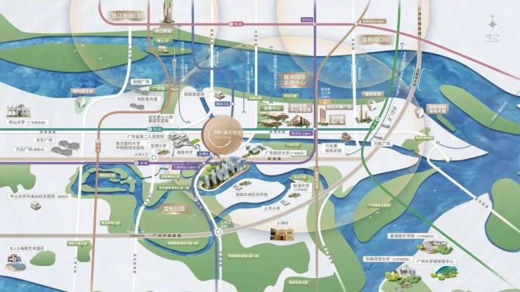 除湿地公园外,项目3公里范围内还有海珠湖公园、瀛洲生态园、广州国际生物岛,四个公园犹如四扇“翡翠屏风”串联一体,十里云水,世界唯一。